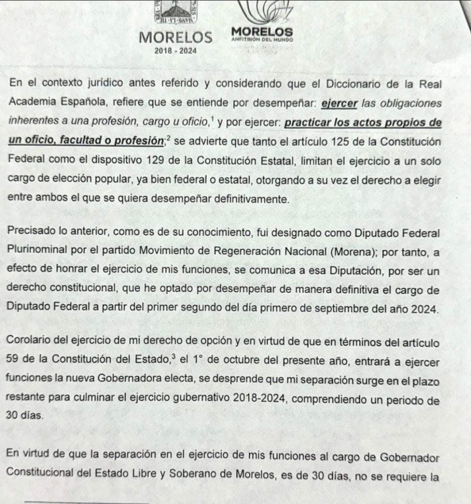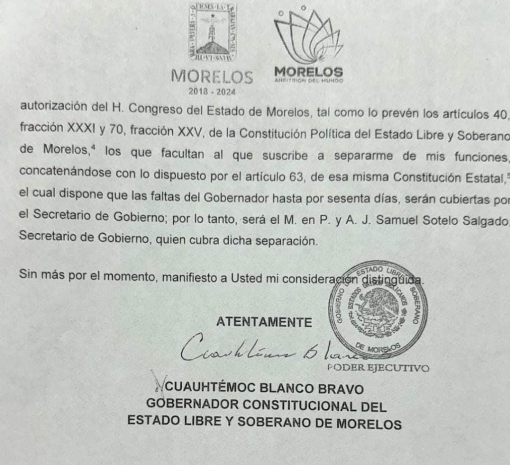 A través de un comunicado, el Gobierno de Morelos informó que el gobernador Cuauhtémoc Blanco Bravo notificó al Congreso del Estado su separación del cargo a partir de las 00:00 horas de este domingo 1 de septiembre, hasta la conclusión del ejercicio gubernamental 2018-2024.