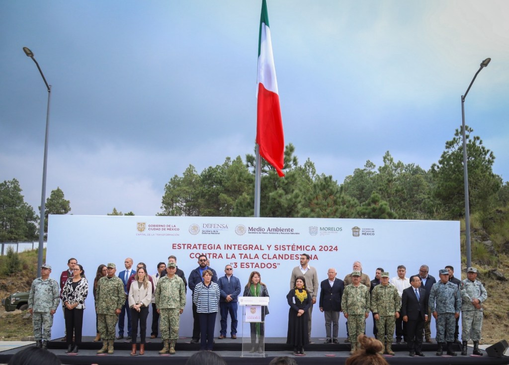 Lo anterior, al participar en la presentación de la Estrategia Integral y Sistémica 2024 contra la Tala Clandestina “3 estados”, que encabeza la Secretaría de la Defensa Nacional (Sedena) y Guardia Nacional (GN), y donde estuvo acompañada de los secretarios de Gobierno, Seguridad y Protección Ciudadana, así como Desarrollo Sustentable.