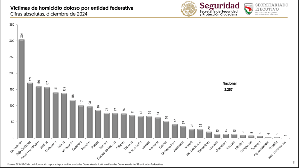 Durante el mes de diciembre, Morelos ocupó el tercer lugar a nivel nacional como el estado con mayor número de homicidios dolosos por cada cien mil habitantes, al registrar una tasa de 4.8; solo superado por Colima con 7.0 y Sinaloa con 5.0.