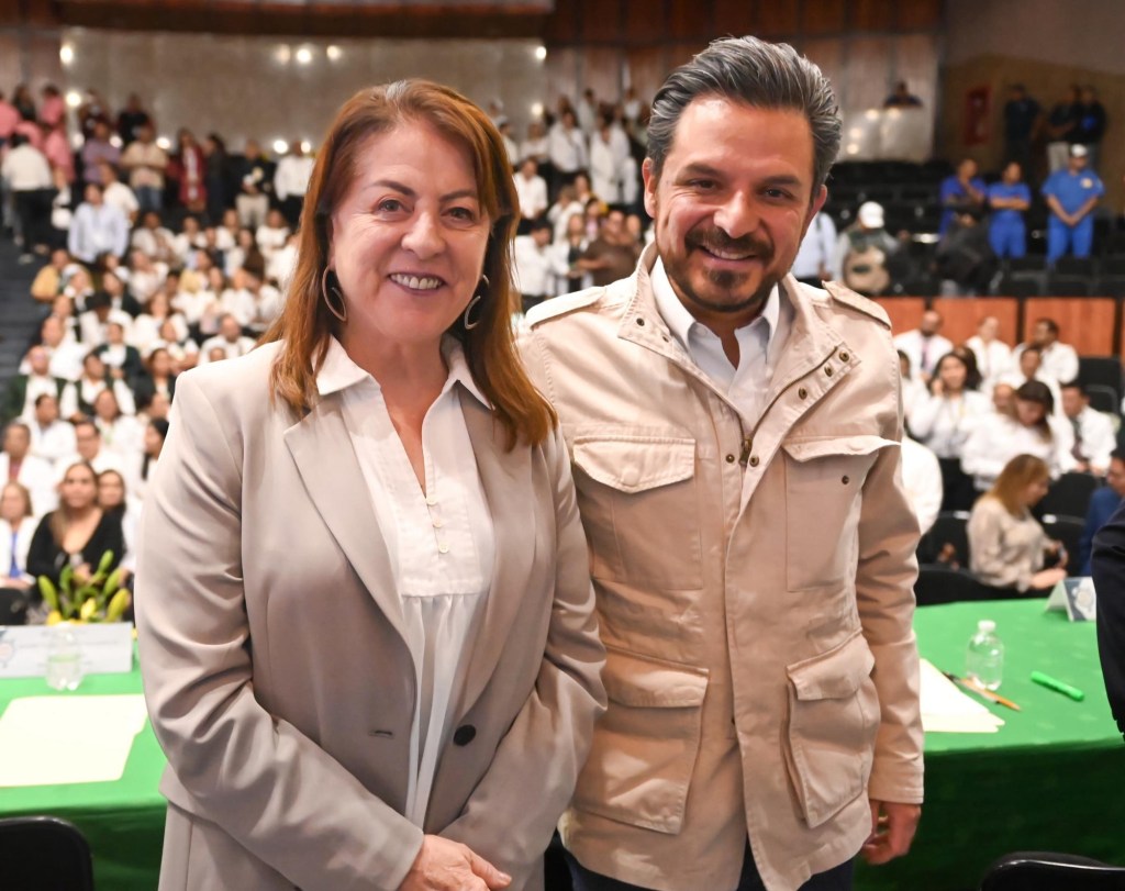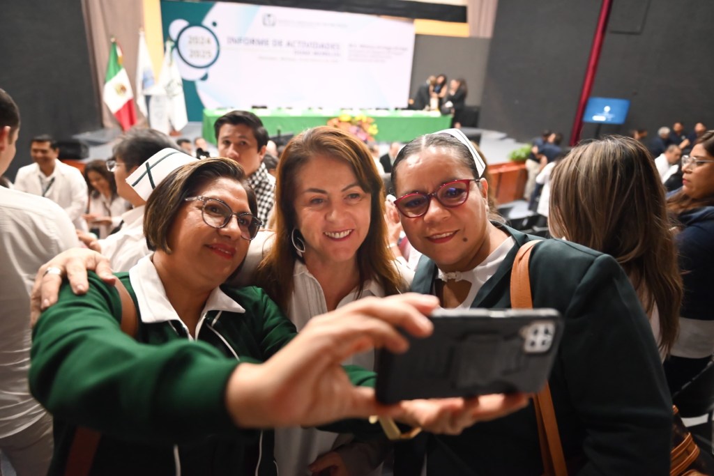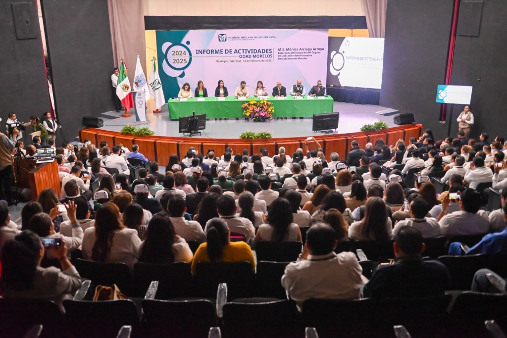 La gobernadora Margarita González Saravia, junto con Zoé Robledo Aburto, director general del Instituto Mexicano del Seguro Social (IMSS), atestiguó el informe de actividades 2024-2025 de Mónica Arriaga Arroyo, encargada del despacho del Órgano de Operación Administrativa Desconcentrada Estatal Morelos de dicha institución.