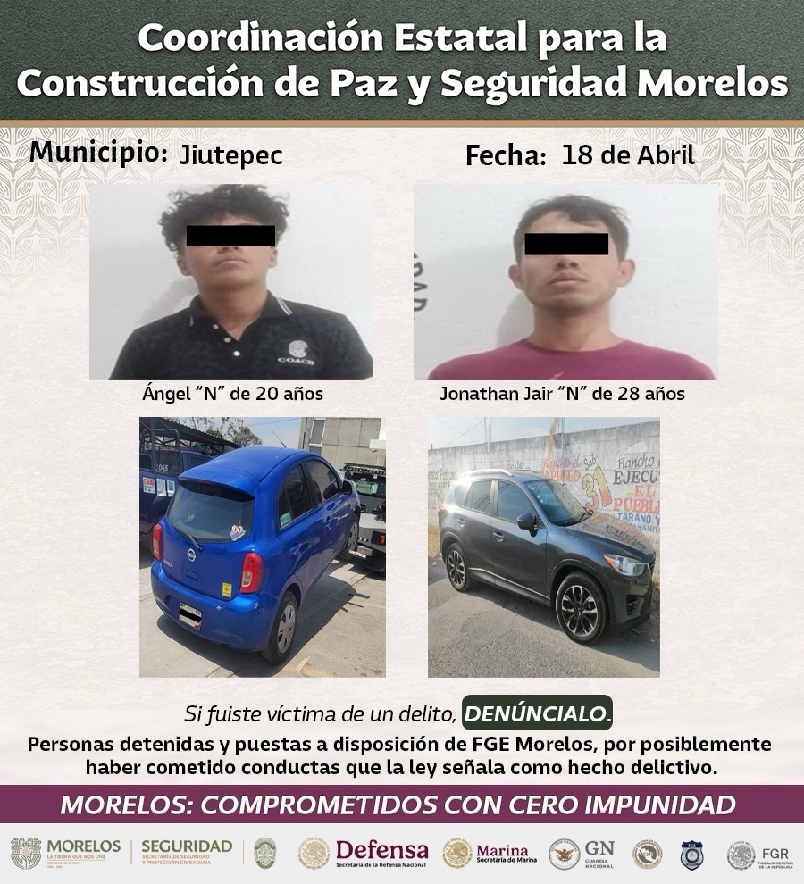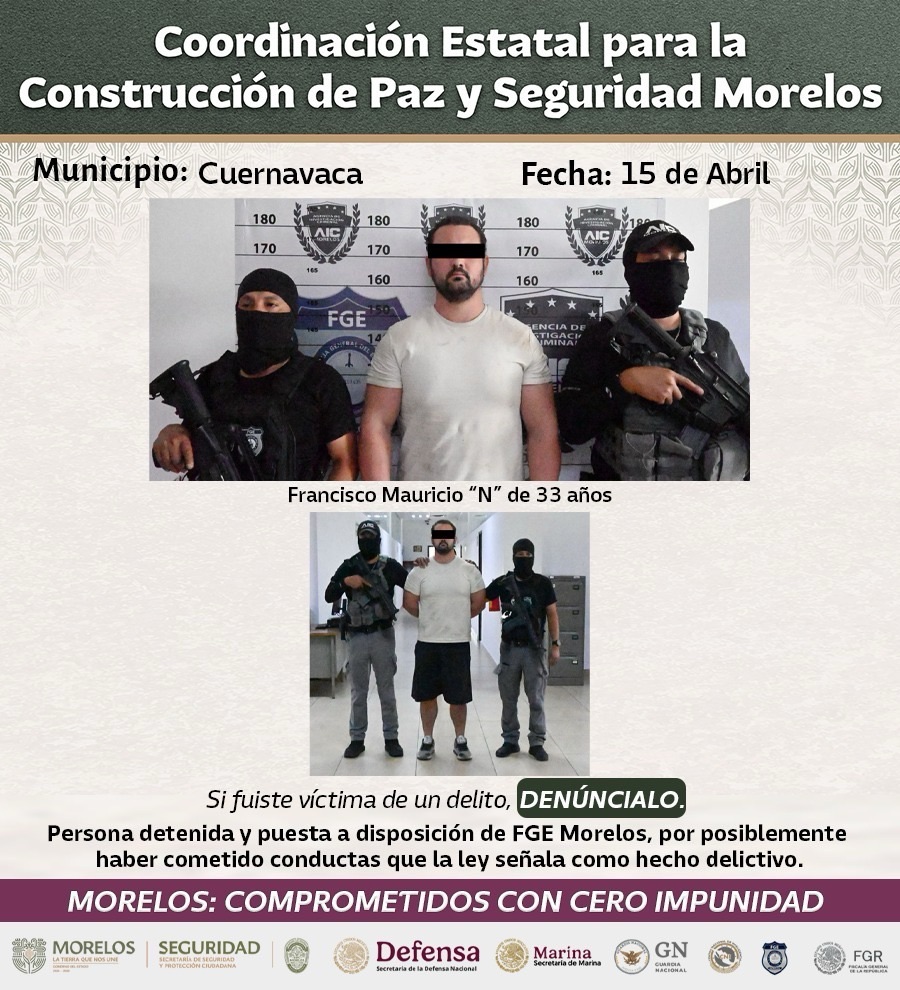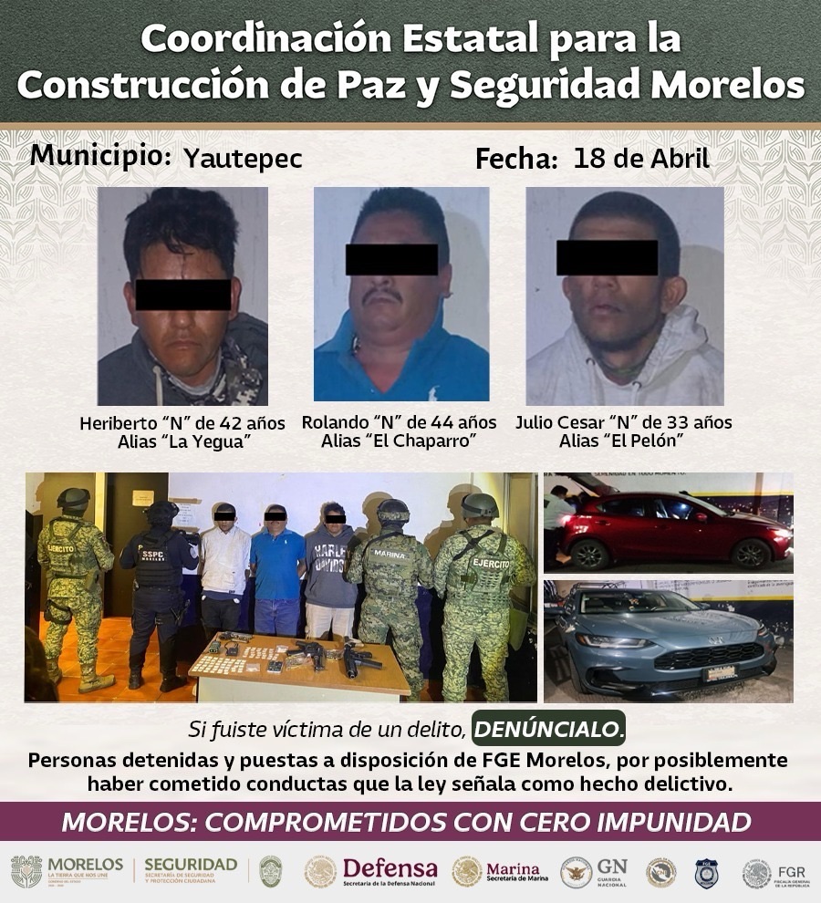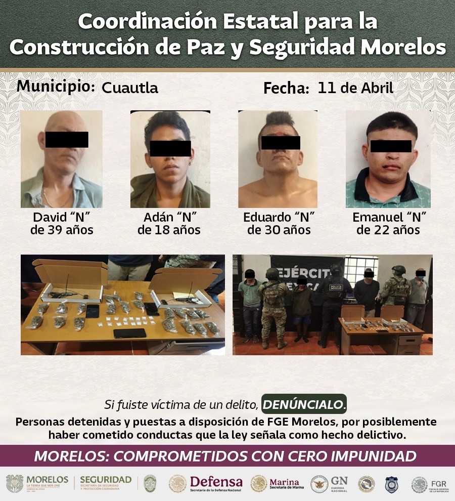 Estas acciones fueron resultado de 10 operativos interinstitucionales, realizados en coordinación con fuerzas federales, estatales y municipales. Las detenciones se efectuaron en Cuernavaca, Cuautla, Jiutepec, Yautepec, Jojutla, Coatetelco, Tepalcingo y Mazatepec.