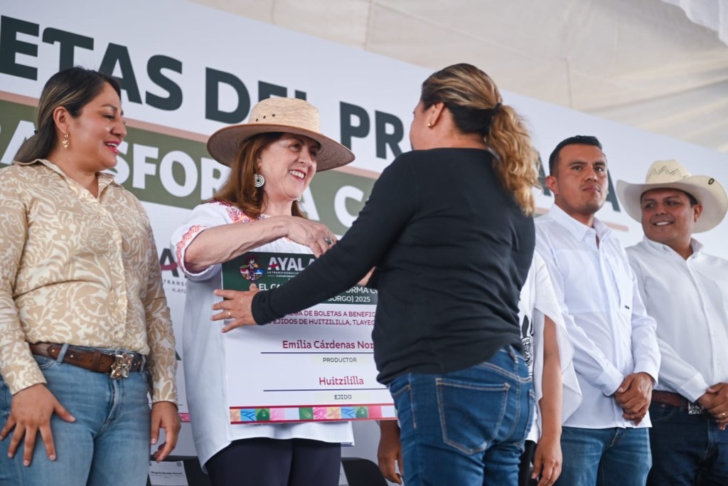 Durante el acto celebrado en la comunidad de Huitzililla, la jefa del Ejecutivo estatal y la presidenta municipal entregaron boletas a beneficiarios como Maximino Muñoz Ortega, Emilia Cárdenas Noriega, Florentino Flores Díaz, Yanet Benito Campos, Cristobalina Villanueva Ortiz y Kevin Yael Vázquez Vázquez.