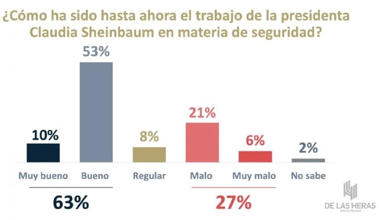 De acuerdo con el estudio de De las Heras Demotecnia, el 62% de los encuestados considera que el gobierno federal ha tenido avances en seguridad, una tendencia positiva comparada con años anteriores, cuando la percepción era más negativa. Además, el 57% opina que los resultados actuales en esta área superan los de administraciones pasadas, mientras que el 31% no ve avances significativos.