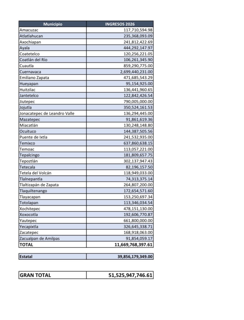 Las leyes de Ingresos aprobadas corresponden a los municipios de Amacuzac, Atlatlahucan, Axochiapan, Ayala, Coatetelco, Coatlán del Río, Cuautla, Cuernavaca, Emiliano Zapata, Hueyapan, Huitzilac, Jantetelco, Jiutepec, Jojutla, Jonacatepec de Leandro Valle, Mazatepec, Miacatlán y, Ocuituco.